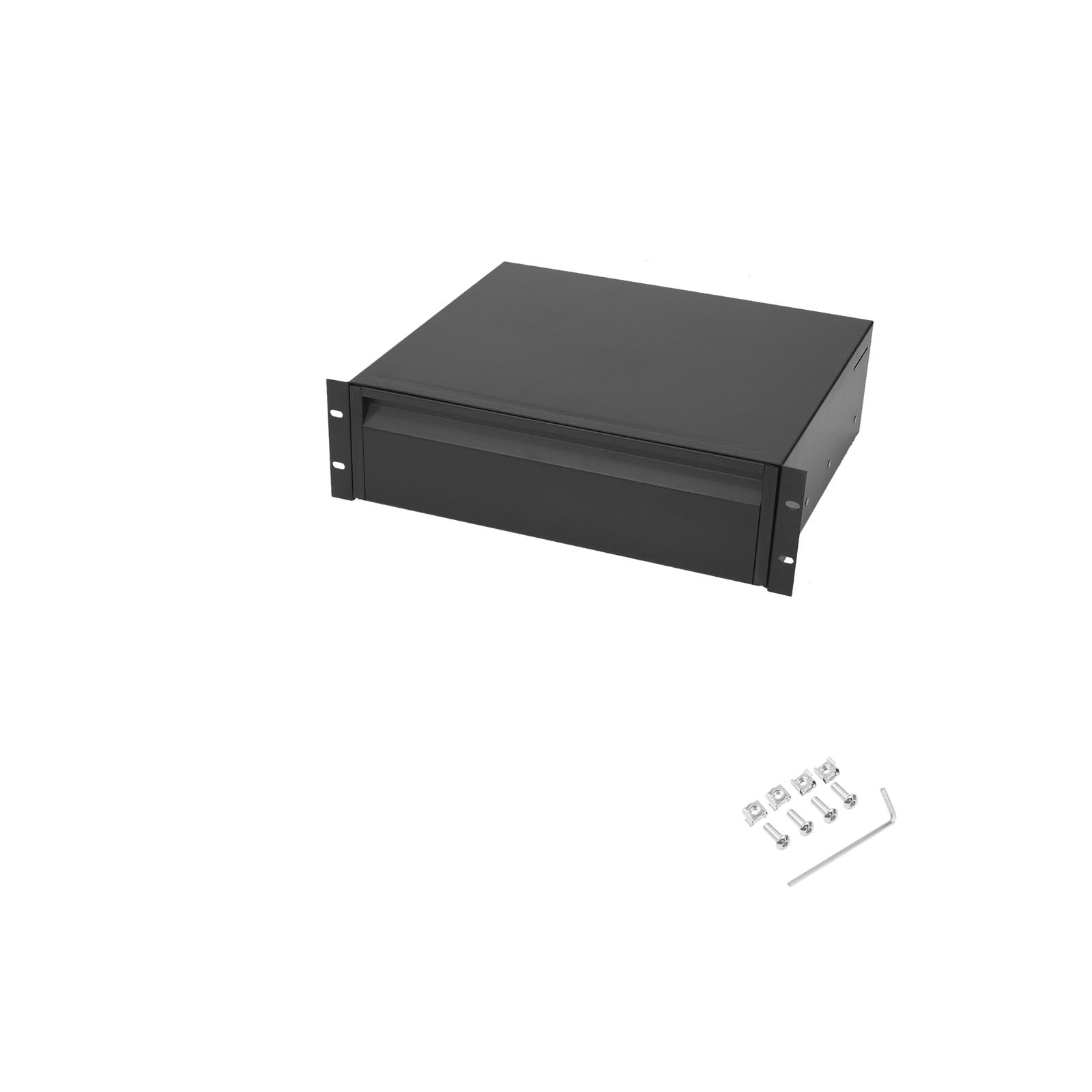 This drawer is 19″ wide, with 388mm instalation depth and 3 Units of rack installation height.