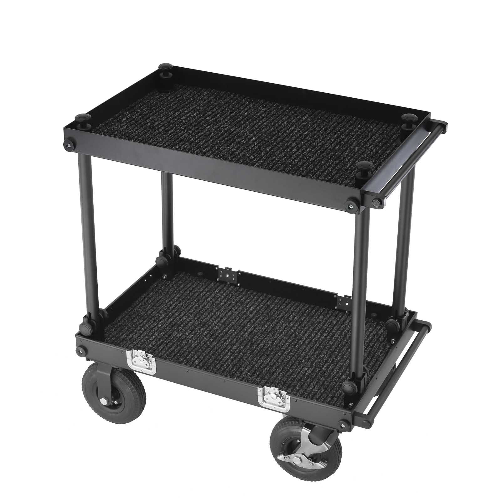 The SMARTONE double deck cart can be used to transport equipment or as a workstation. We applied durable materials to face the harsh on set conditions, tires are made from 4-layer gum placed on strong steel rims equipped with 2 manual foot brakes with force regulation for secure and save routing on most of the surfaces, aluminum structure is lightweight and sustained enough to hold up to 200 kilograms, no tools are required to attach of remove each wheel or any part of the cart what saves your time. We developed a list of details which can improve the quality of usage like small transport wheels, props and deflects. Compact size allows the cart to transport easily all parts in one case.