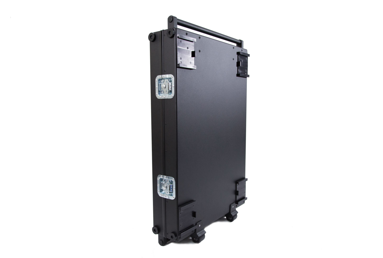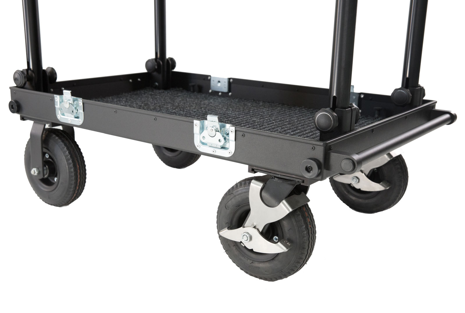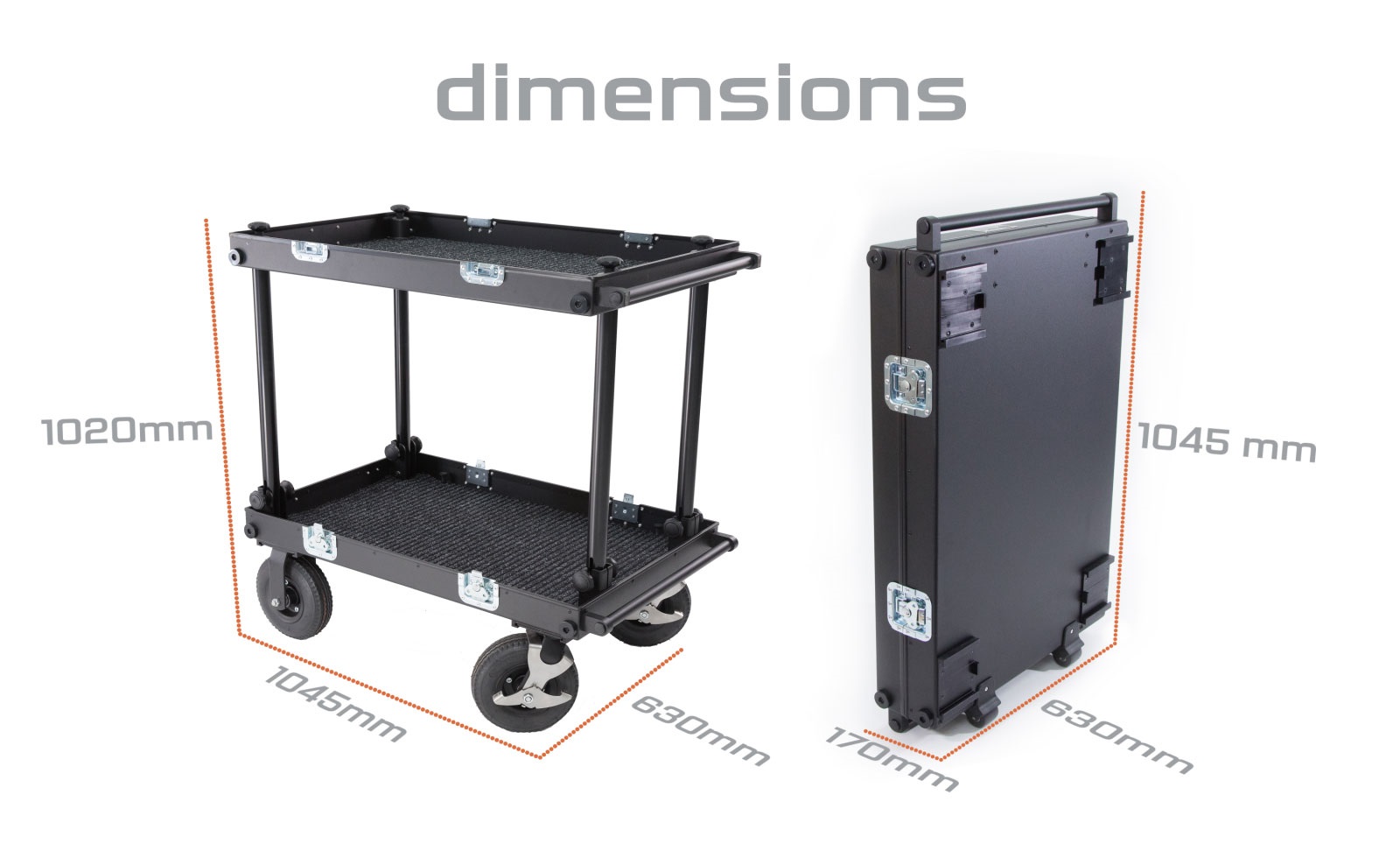 The SMARTONE double deck cart can be used to transport equipment or as a workstation. We applied durable materials to face the harsh on set conditions, tires are made from 4-layer gum placed on strong steel rims equipped with 2 manual foot brakes with force regulation for secure and save routing on most of the surfaces, aluminum structure is lightweight and sustained enough to hold up to 200 kilograms, no tools are required to attach of remove each wheel or any part of the cart what saves your time. SMARTONE is super easy to collapse and ready to use in less than 2 minutes with additional dedicated accessories for installing heavy monitors, steadicam or headfixing. We developed a list of details which can improve the quality of usage like small transport wheels, props and deflects. Compact size allows the cart to transport easily all parts in one case. 220mm and 260mm diameter wheels fits inside the collpased cart.