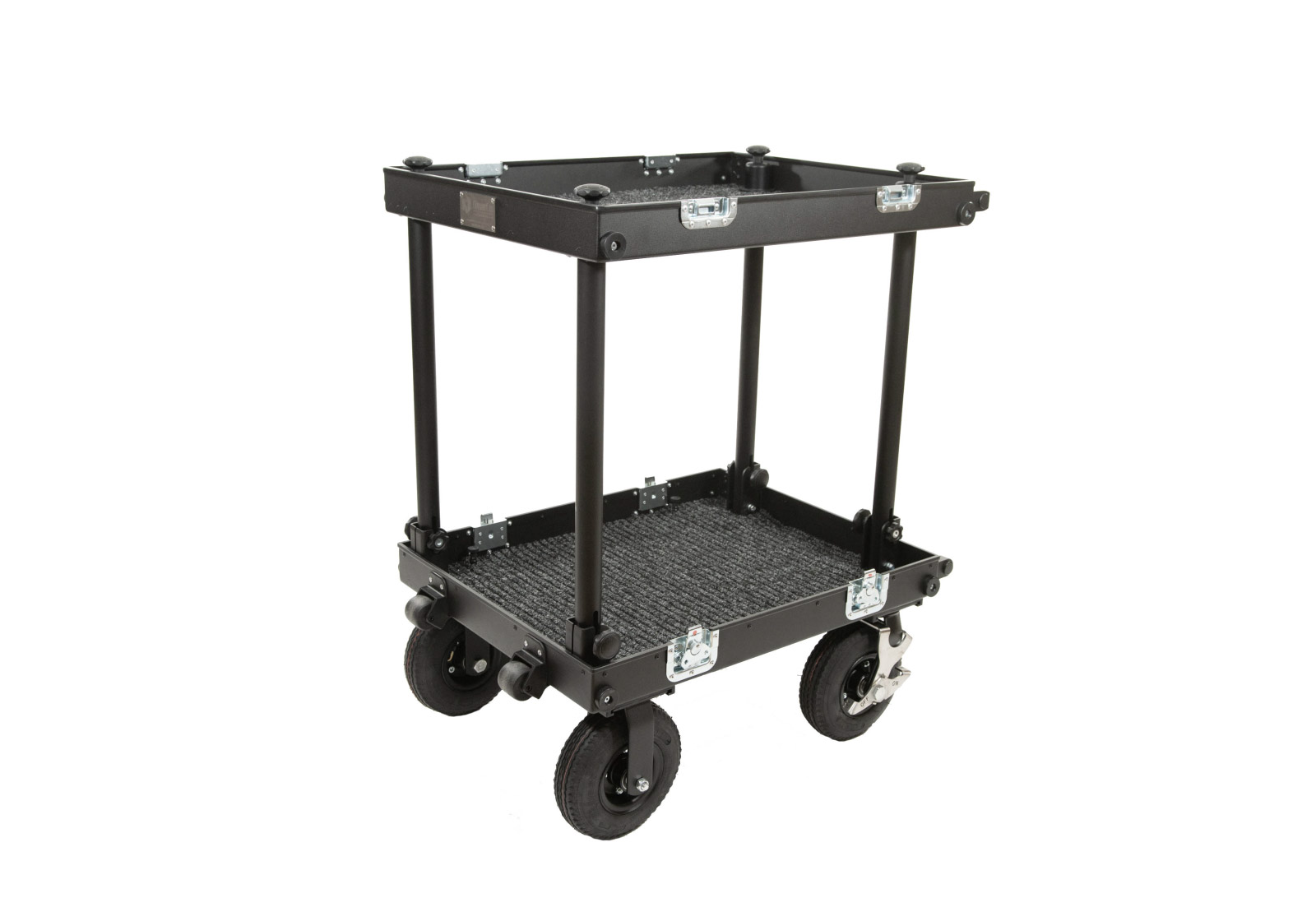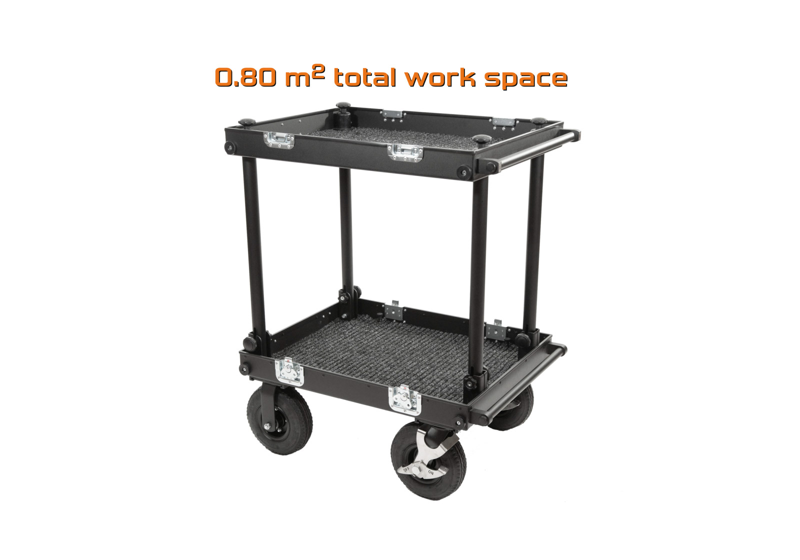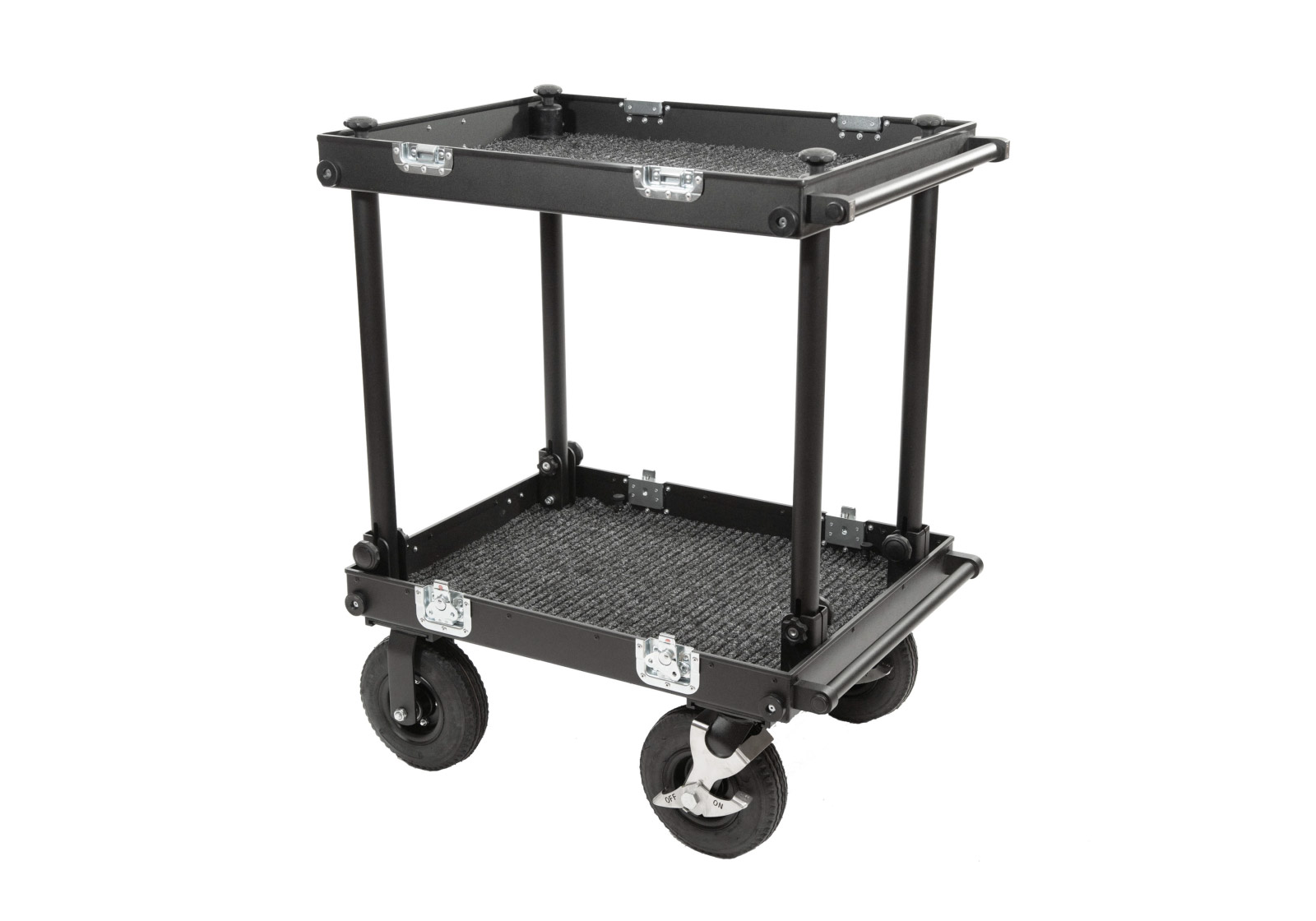 The SMARTONE MINI double deck cart can be used to transport equipment or as a sound department cart. We applied durable materials to face the harsh on set conditions, tires are made from 4-layer gum placed on strong steel rims equipped with 2 manual foot brakes with force regulation for secure and save routing on most of surfaces. Aluminum structure is lightweight and sustained enough to hold up to 200 kilograms, no tools are required to attach of remove each wheel or any part of the cart what saves your time. SMARTONE MINI is super easy to collapse and ready to use in less than 2 minutes. We developed a list of details which can improve the quality of usage like small transport wheels, props and deflects. Compact size allows the cart to transport easily all parts in one case. 220mm diameter wheels fits inside the collpased cart.