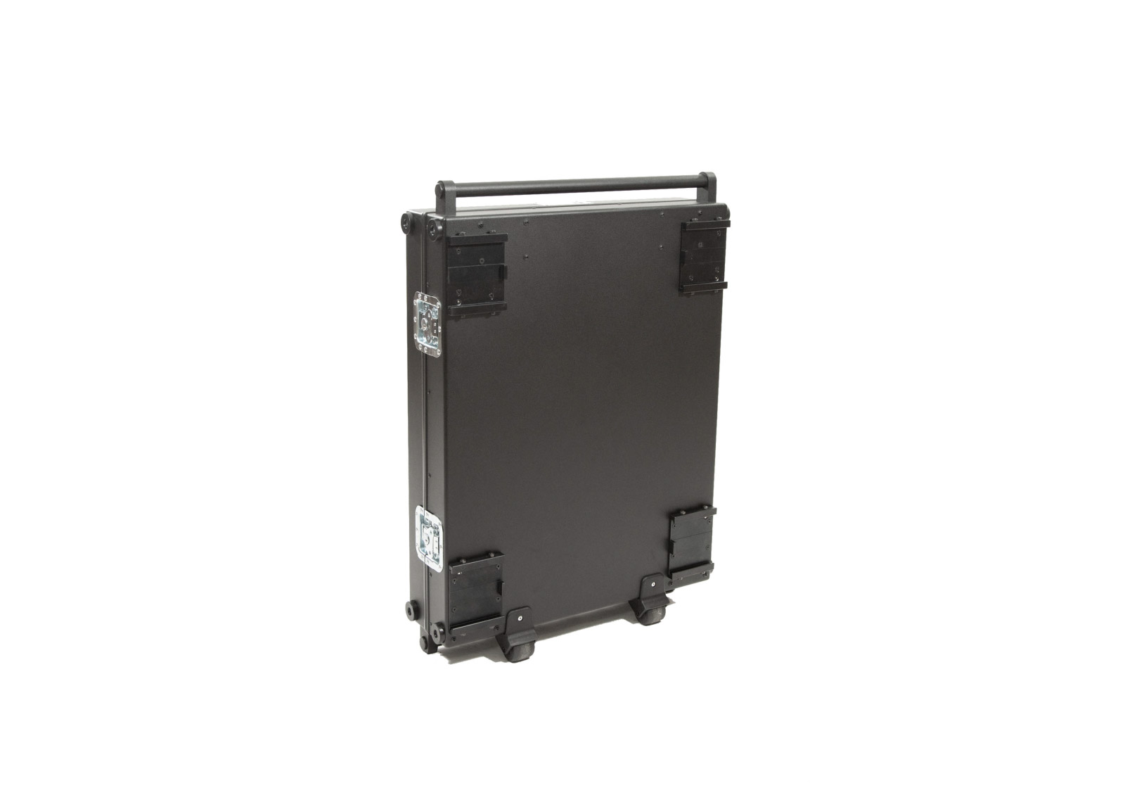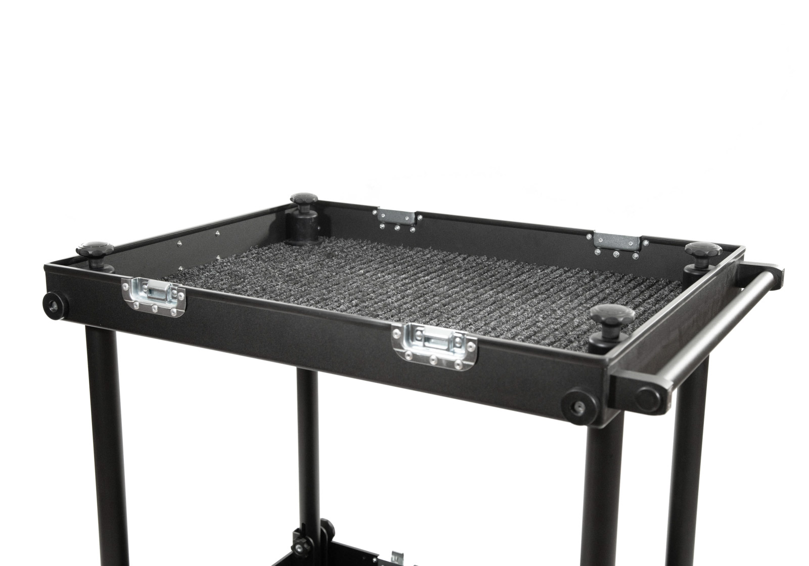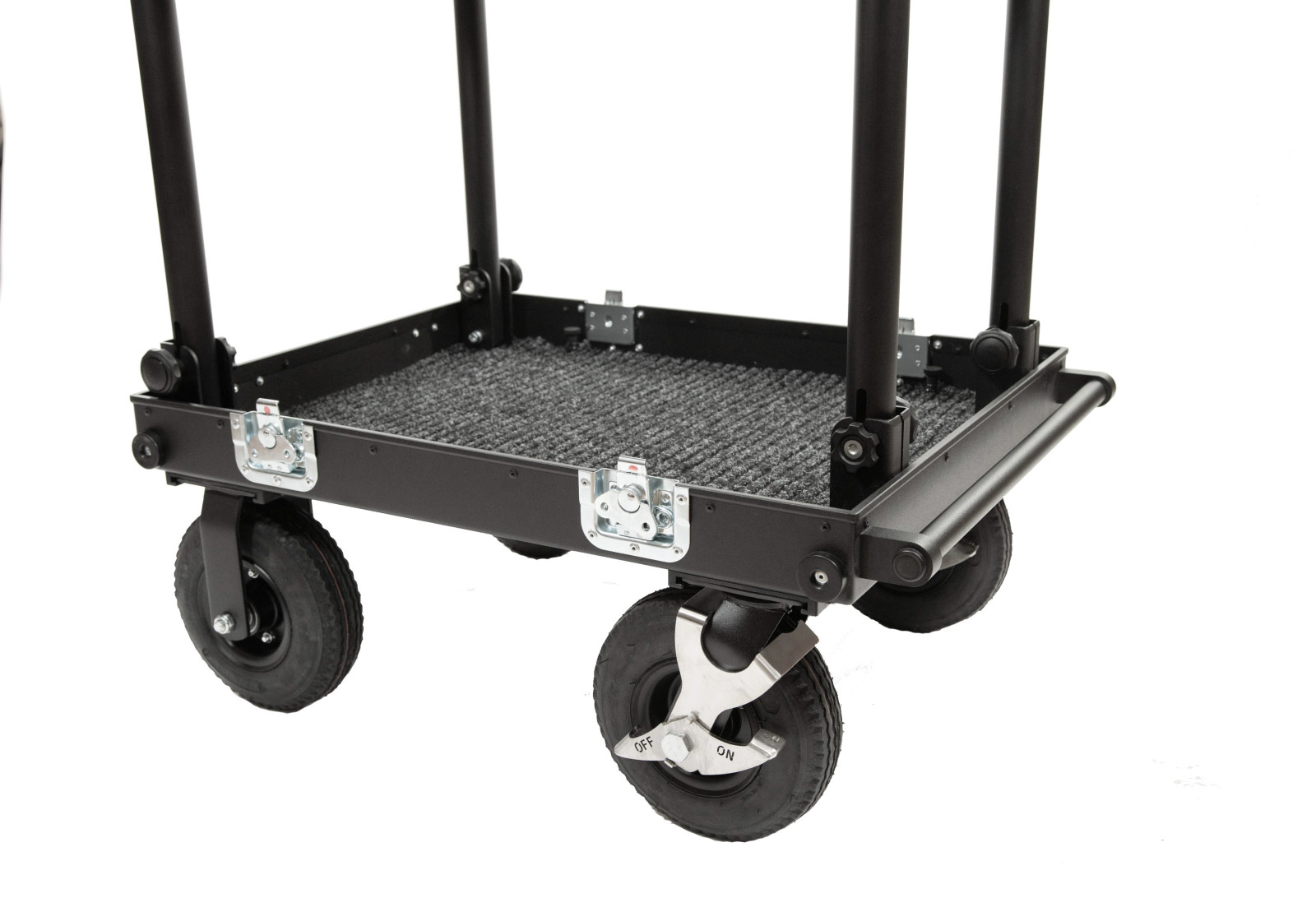 The SMARTONE MINI double deck cart can be used to transport equipment or as a sound department cart. We applied durable materials to face the harsh on set conditions, tires are made from 4-layer gum placed on strong steel rims equipped with 2 manual foot brakes with force regulation for secure and save routing on most of surfaces. Aluminum structure is lightweight and sustained enough to hold up to 200 kilograms, no tools are required to attach of remove each wheel or any part of the cart what saves your time. SMARTONE MINI is super easy to collapse and ready to use in less than 2 minutes. We developed a list of details which can improve the quality of usage like small transport wheels, props and deflects. Compact size allows the cart to transport easily all parts in one case. 220mm diameter wheels fits inside the collpased cart.