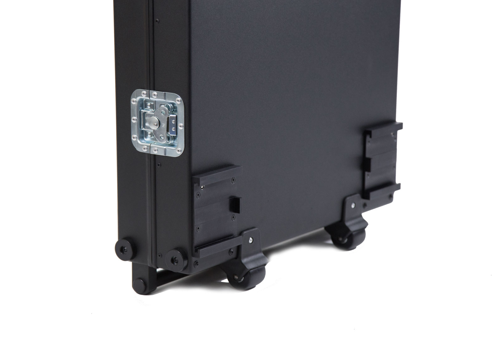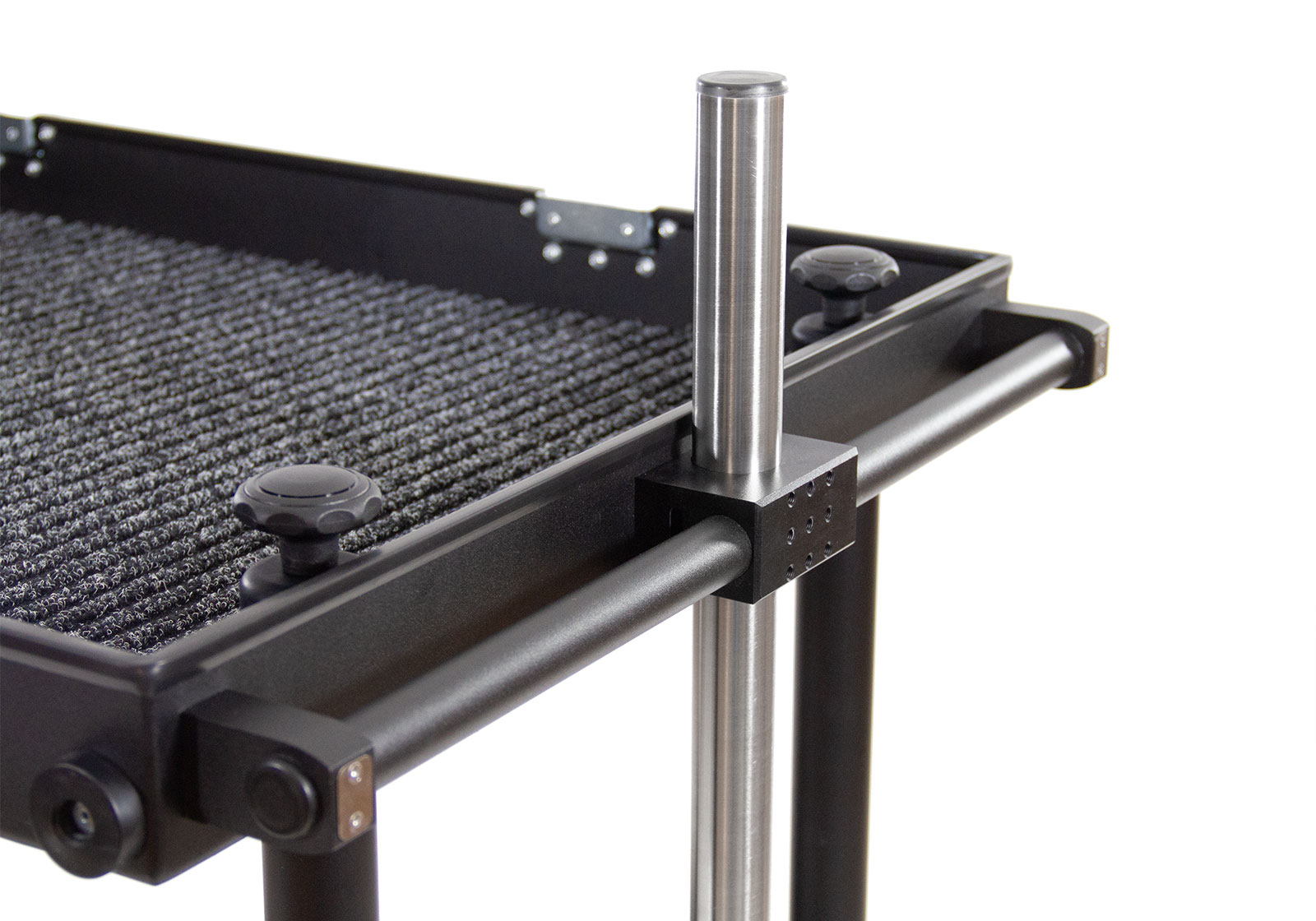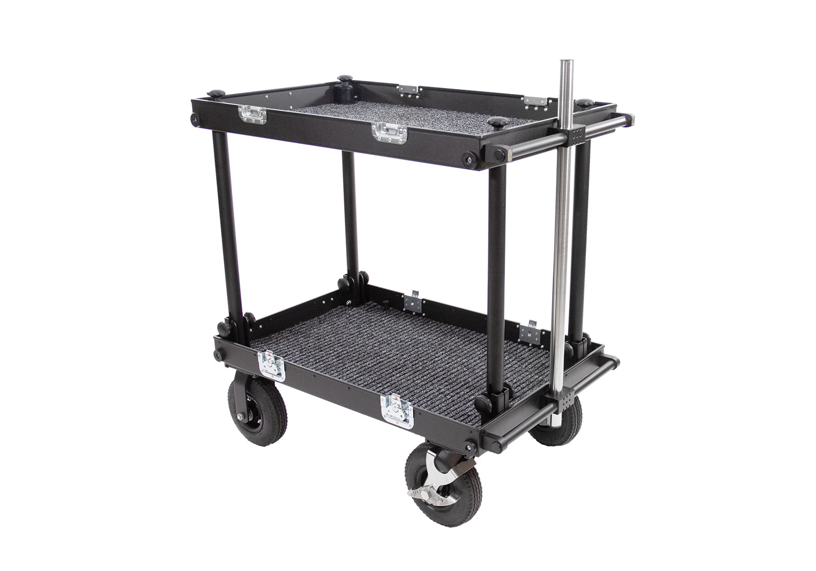The SMARTONE double deck cart can be use to transport equipment or as a workstation. We applied durable materials to face the harsh on set conditions, tires are made from 4-layer gum placed on strong steel rims equipped with 2 manual foot brakes with force regulation for secure and save routing on most of surfaces, aluminum structure is lightweight and sustained enough to hold up to 200 kilograms, no tools required to attach of remove each wheel or any part of the cart what saves your time. SMARTONE is super easy to collapse and ready to use in less than 2 minutes with additional dedicated accessories for installing heavy monitors, steadicam or headfixing. We developed a list of details which can improve the quality of usage like small transport wheels, props and deflects. Compact size allow the cart to transport easily all parts in one case. New handle with built-in 35mm pipe clamp, makes construction stronger and allow to install ball mount directly on the pipe. The upper and lower handle are prepared to install Manfrotto – 035FTC – Super Clamp. 220mm and 260mm diameter wheels fits inside the collpased cart.