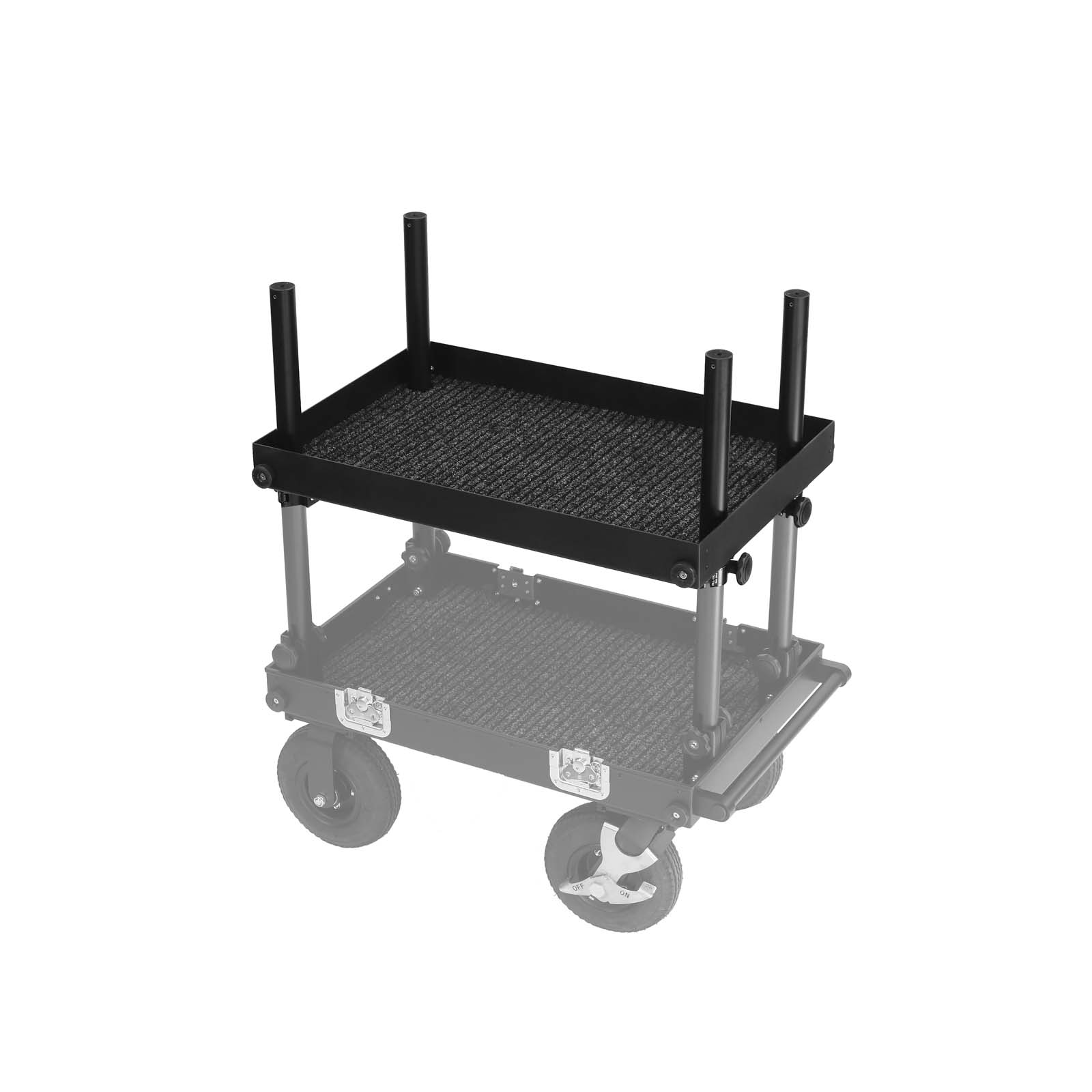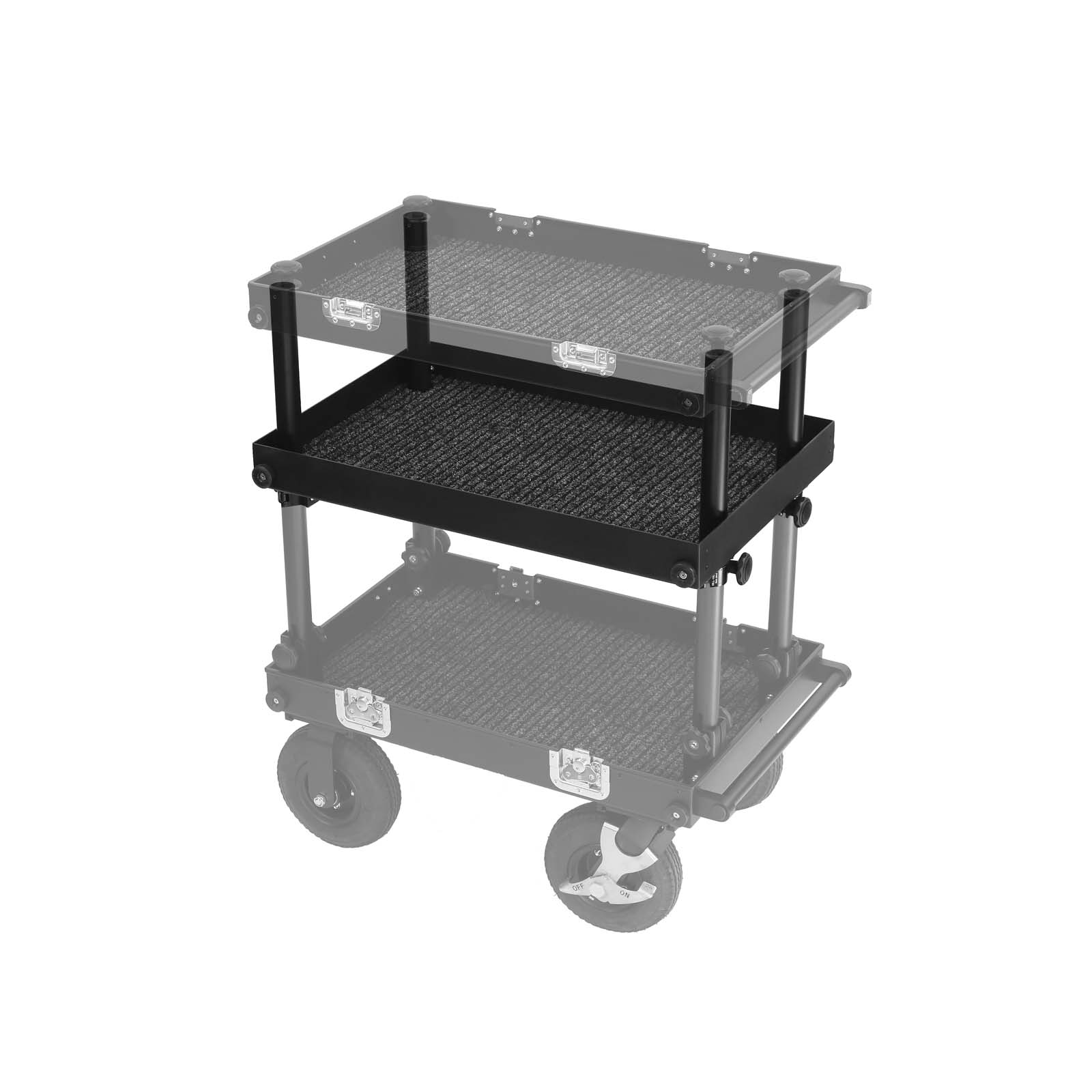 Regular shelf without locks extends possibilities to mount more accessories on side walls (disables full cart collapsing), great to transport equipement or as a workatation