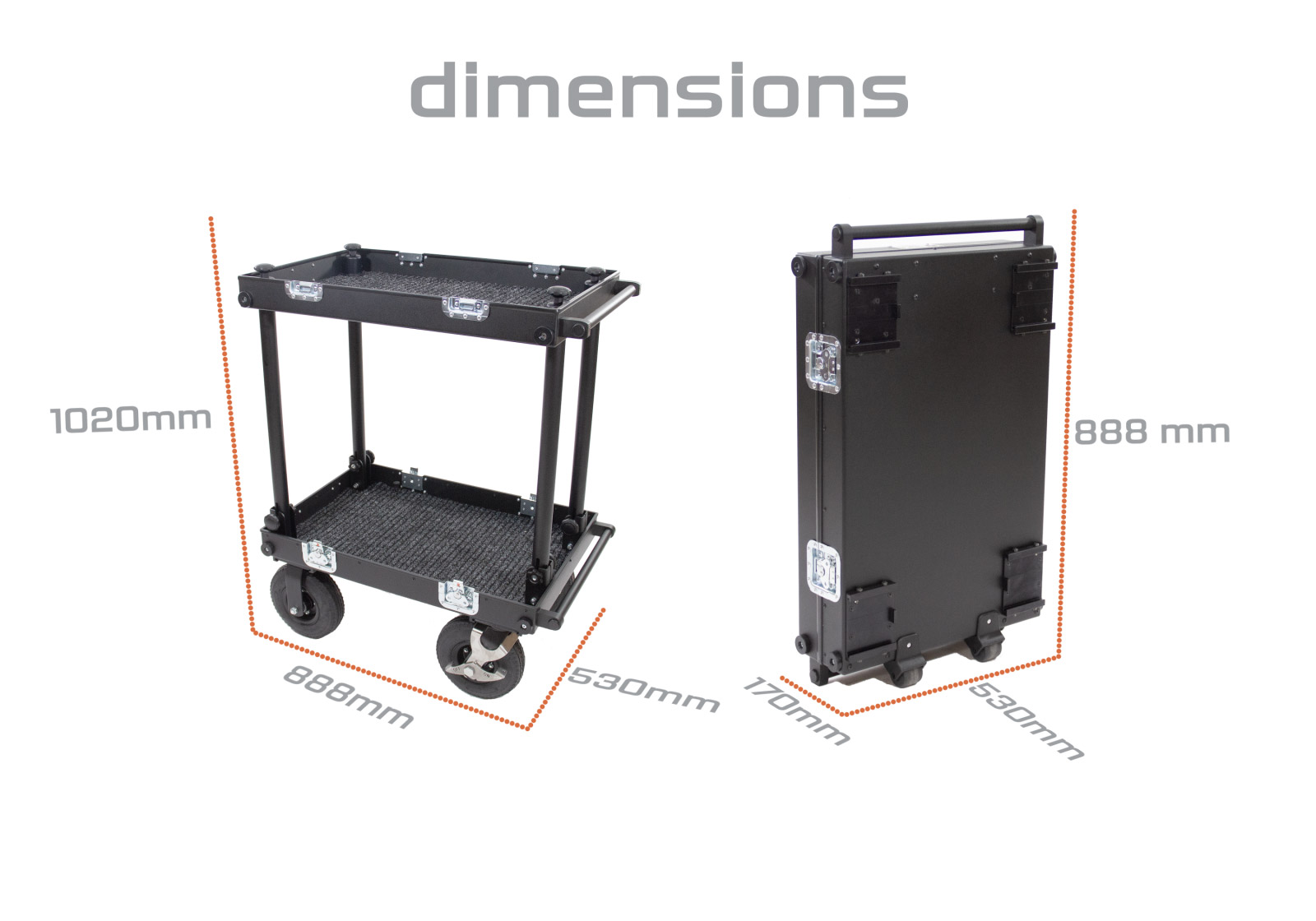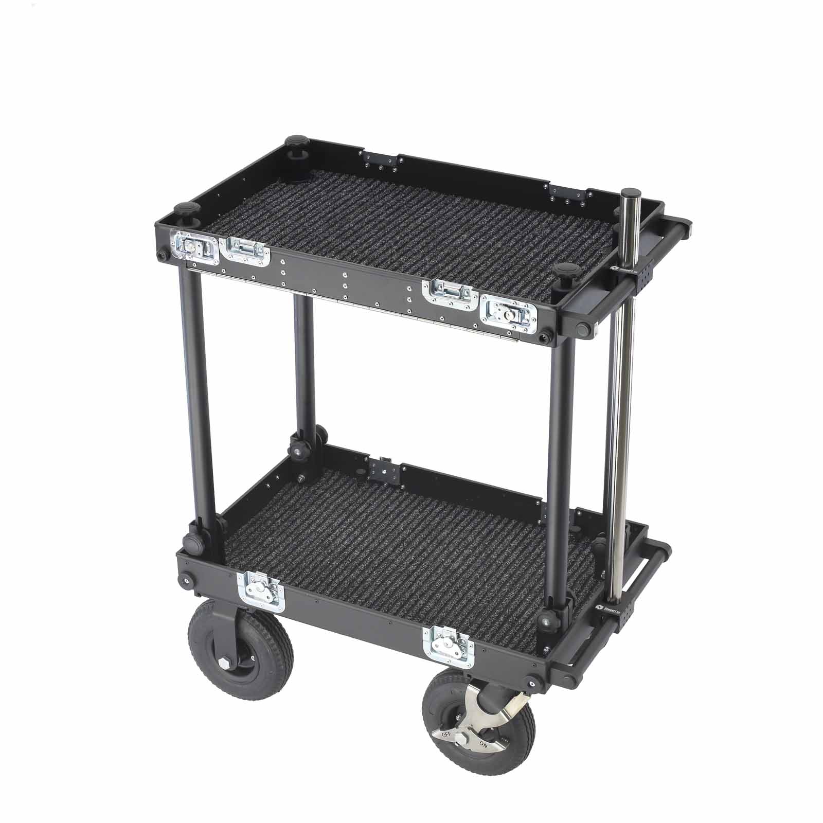 The SMARTONE MICRO double deck cart can be used to transport equipment or as a sound department cart. We applied durable materials to face the harsh on set conditions, tires are made from 4-layer gum placed on strong steel rims equipped with 2 manual foot brakes with force regulation for secure and save routing on most of surfaces, aluminum structure is lightweight and sustained enough to hold up to 200 kilograms, no tools are required to attach of remove each wheel or any part of the cart what saves your time. SMARTONE MICRO is super easy to collapse and ready to use in less than 2 minutes. We developed a list of details which can improve the quality of usage like small transport wheels, props and deflects. Compact size allows the cart to transport easily all parts in one case. Only three from 220mm diameter wheels fits inside the collpased cart. We add a special bag to which you can fit the remaining wheel or all four wheels.
