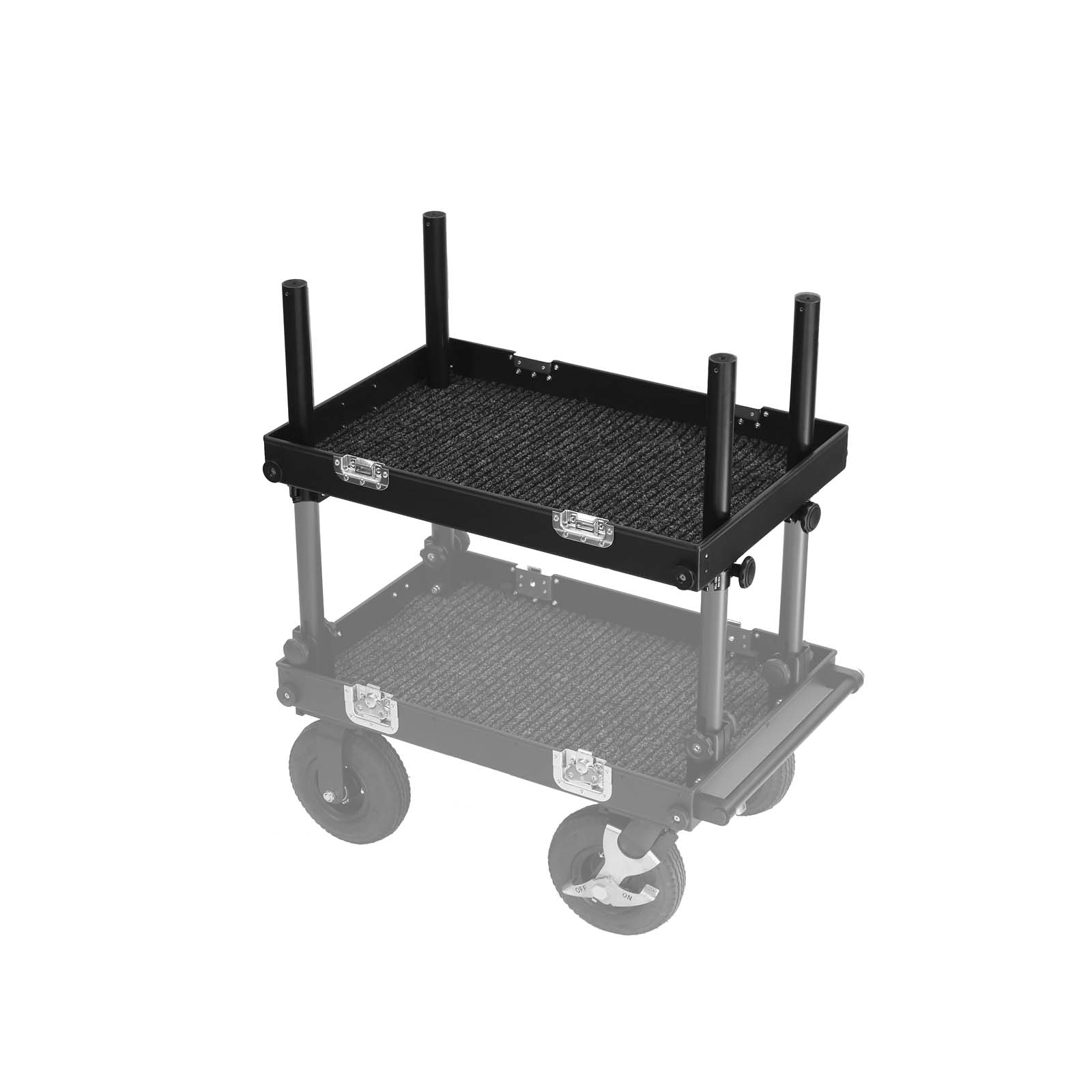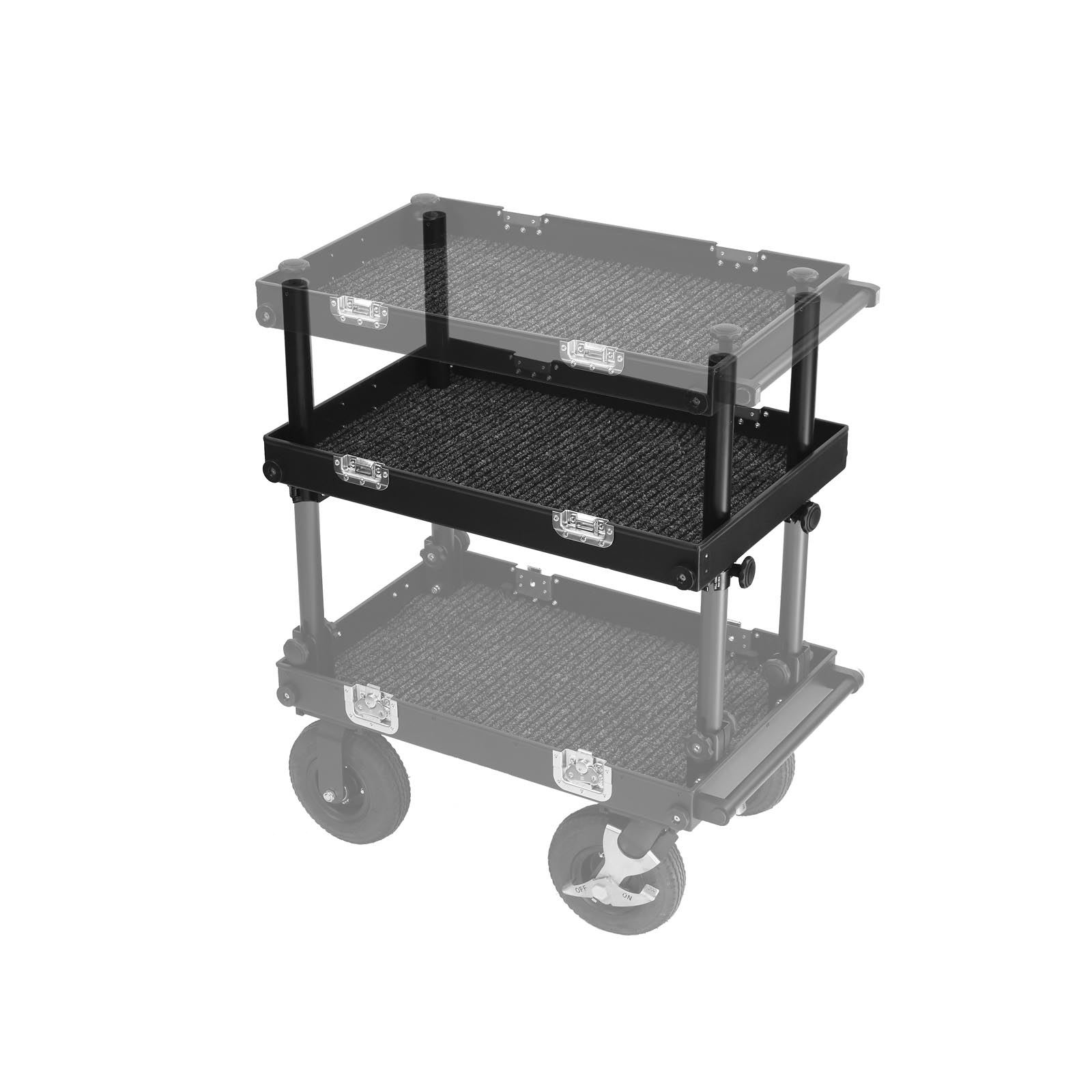 Regular shelf is best solution when using filmcart to transport equipement or as a workstation, higher walls can be used to mount accessories with quick clamp system. Smartone can be fully folded and transported.