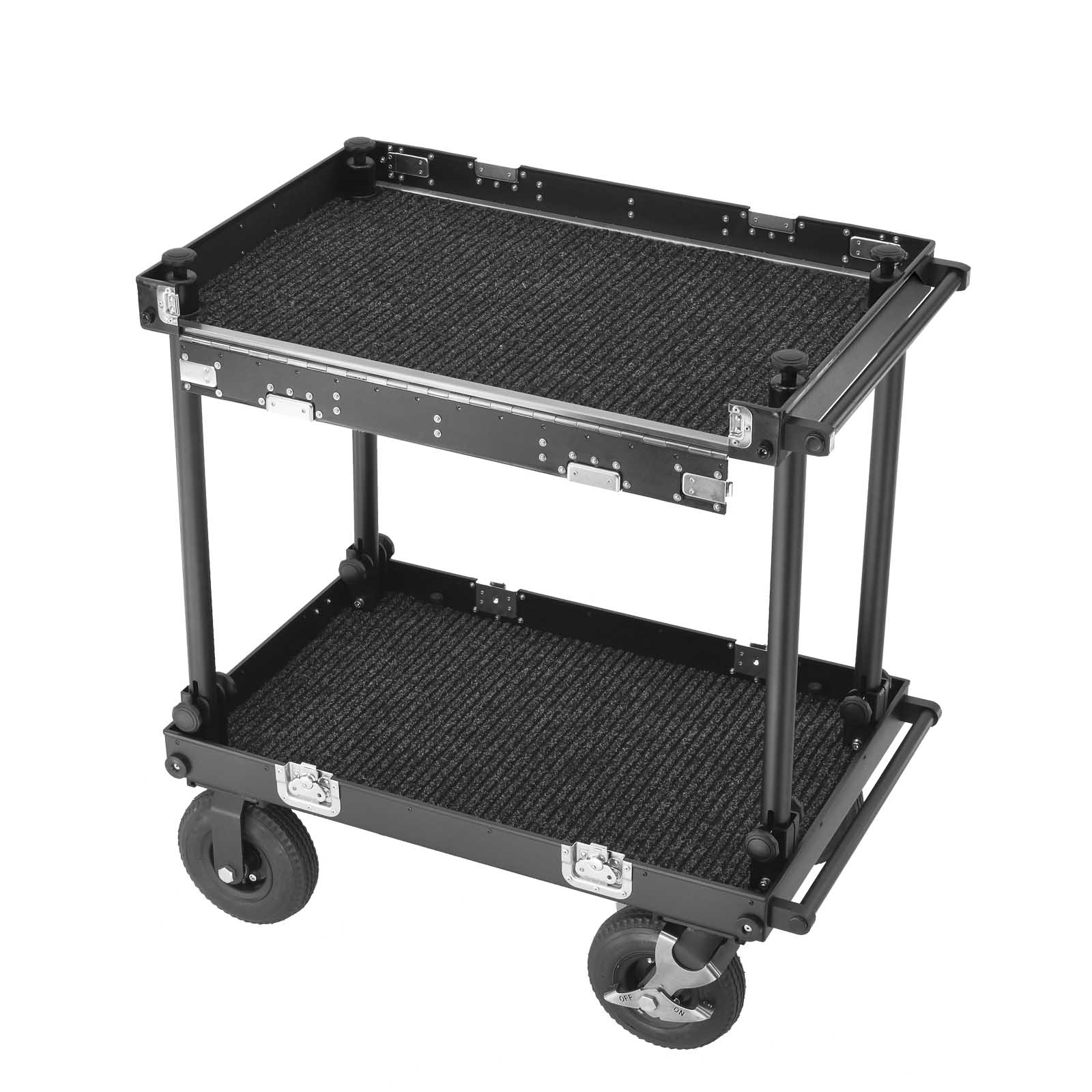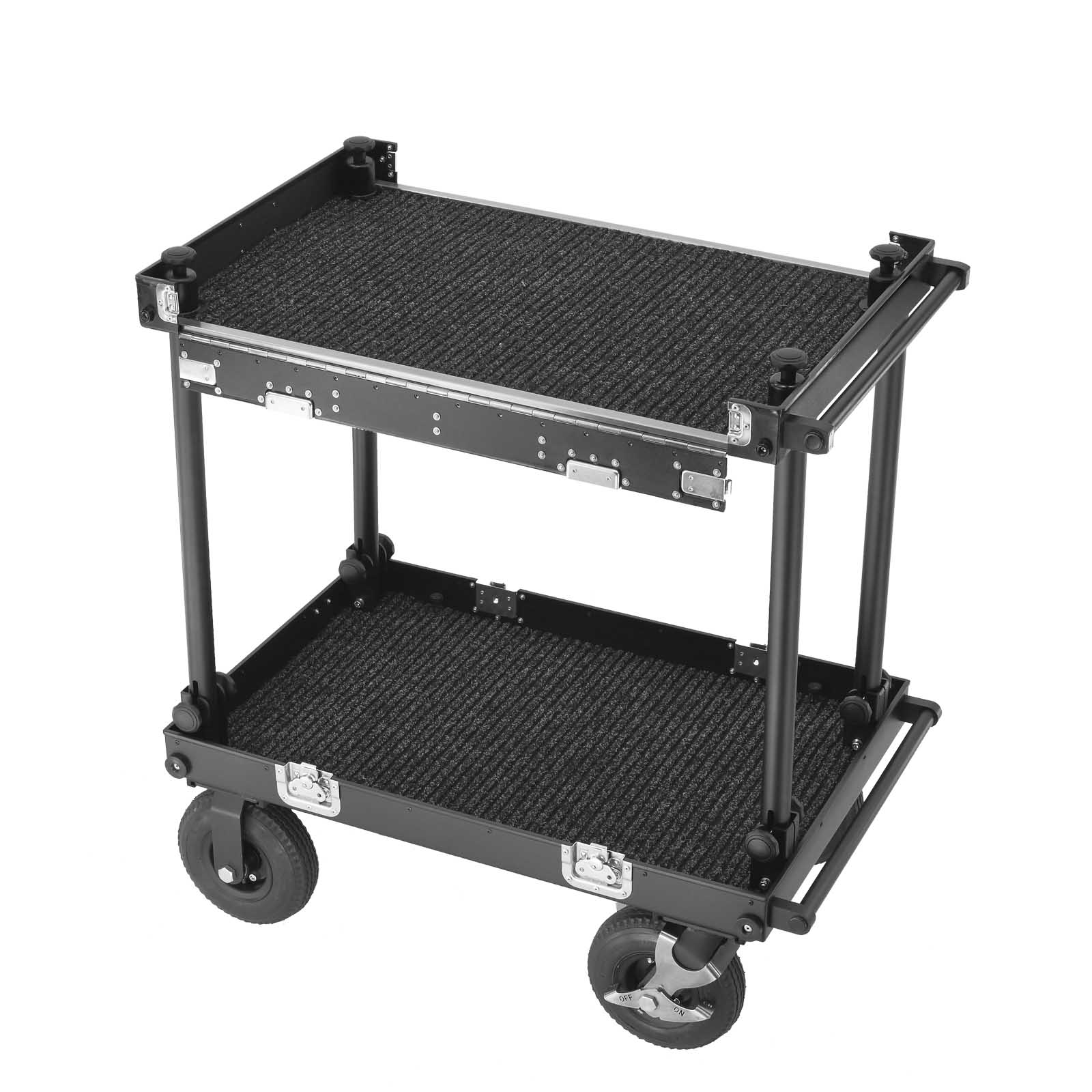 The SMARTONE MINI double deck cart can be used to transport equipment or as a sound department cart. We applied durable materials to face the harsh on set conditions, tires are made from 4-layer gum placed on strong steel rims equipped with 2 manual foot brakes with force regulation for secure and save routing on most of surfaces. Aluminum structure is lightweight and sustained enough to hold up to 200 kilograms, no tools are required to attach of remove each wheel or any part of the cart what saves your time. SMARTONE MINI is super easy to collapse and ready to use in less than 2 minutes. We developed a list of details which can improve the quality of usage like small transport wheels, props and deflects. Compact size allows the cart to transport easily all parts in one case. 220mm diameter wheels fits inside the collpased cart.