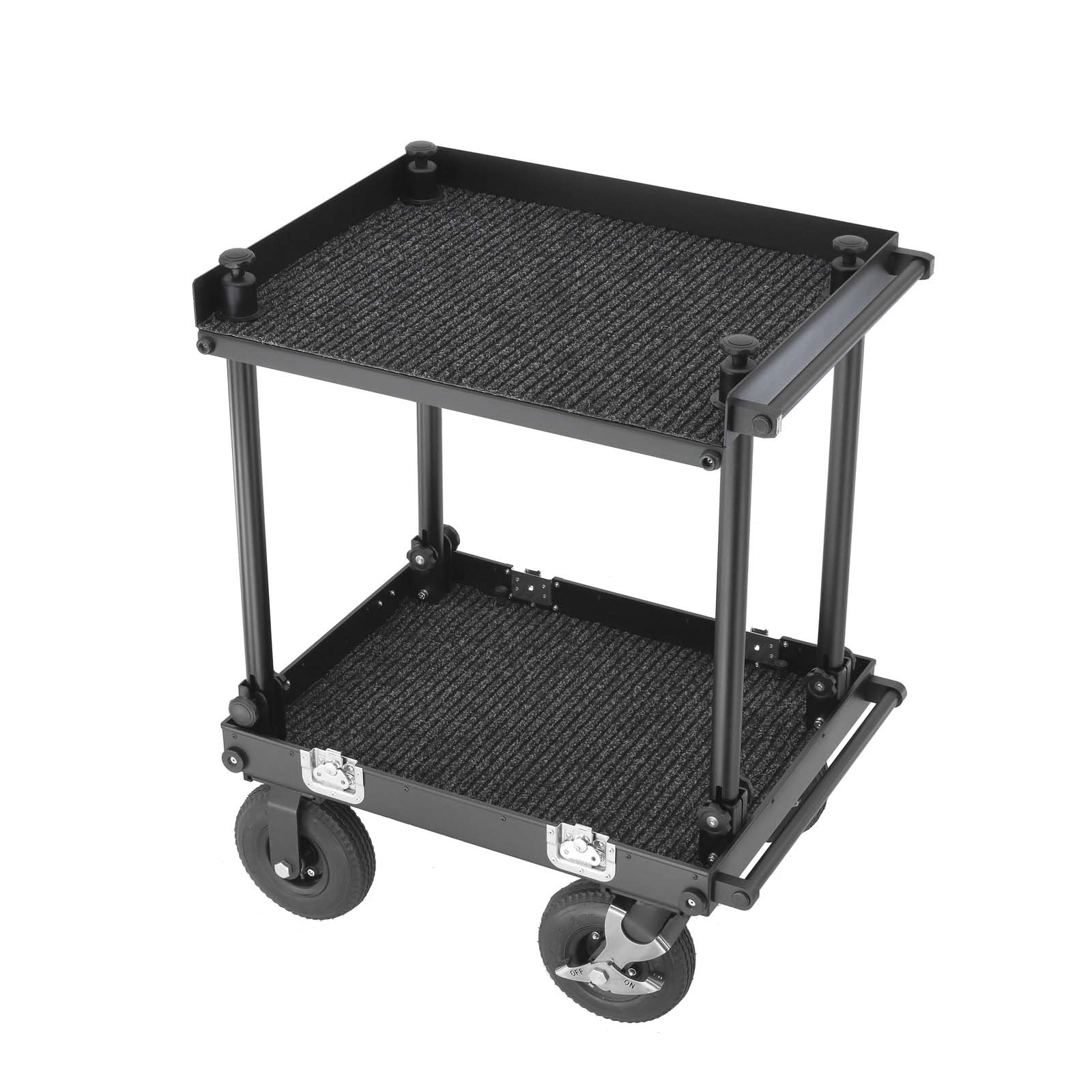 The SMARTONE MINI double deck cart can be used to transport equipment or as a sound department cart. We applied durable materials to face the harsh on set conditions, tires are made from 4-layer gum placed on strong steel rims equipped with 2 manual foot brakes with force regulation for secure and save routing on most of surfaces. Aluminum structure is lightweight and sustained enough to hold up to 200 kilograms, no tools are required to attach of remove each wheel or any part of the cart what saves your time. We developed a list of details which can improve the quality of usage like small transport wheels, props and deflects. Compact size allows the cart to transport easily all parts in one case. 220mm diameter wheels fits inside the collpased cart.