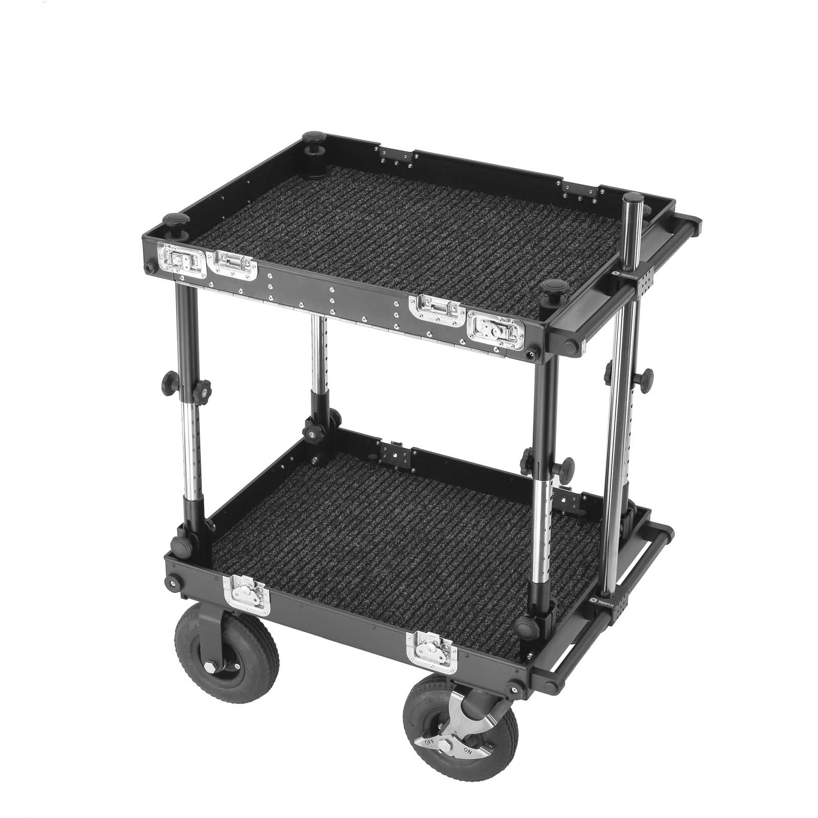 The SMARTONE MINI double deck cart can be used to transport equipment or as a sound department cart. We applied durable materials to face the harsh on set conditions, tires are made from 4-layer gum placed on strong steel rims equipped with 2 manual foot brakes with force regulation for secure and save routing on most of surfaces. Aluminum structure is lightweight and sustained enough to hold up to 200 kilograms, no tools are required to attach of remove each wheel or any part of the cart what saves your time. SMARTONE MINI is super easy to collapse and ready to use in less than 2 minutes. We developed a list of details which can improve the quality of usage like small transport wheels, props and deflects. Compact size allows the cart to transport easily all parts in one case. 220mm diameter wheels fits inside the collpased cart.