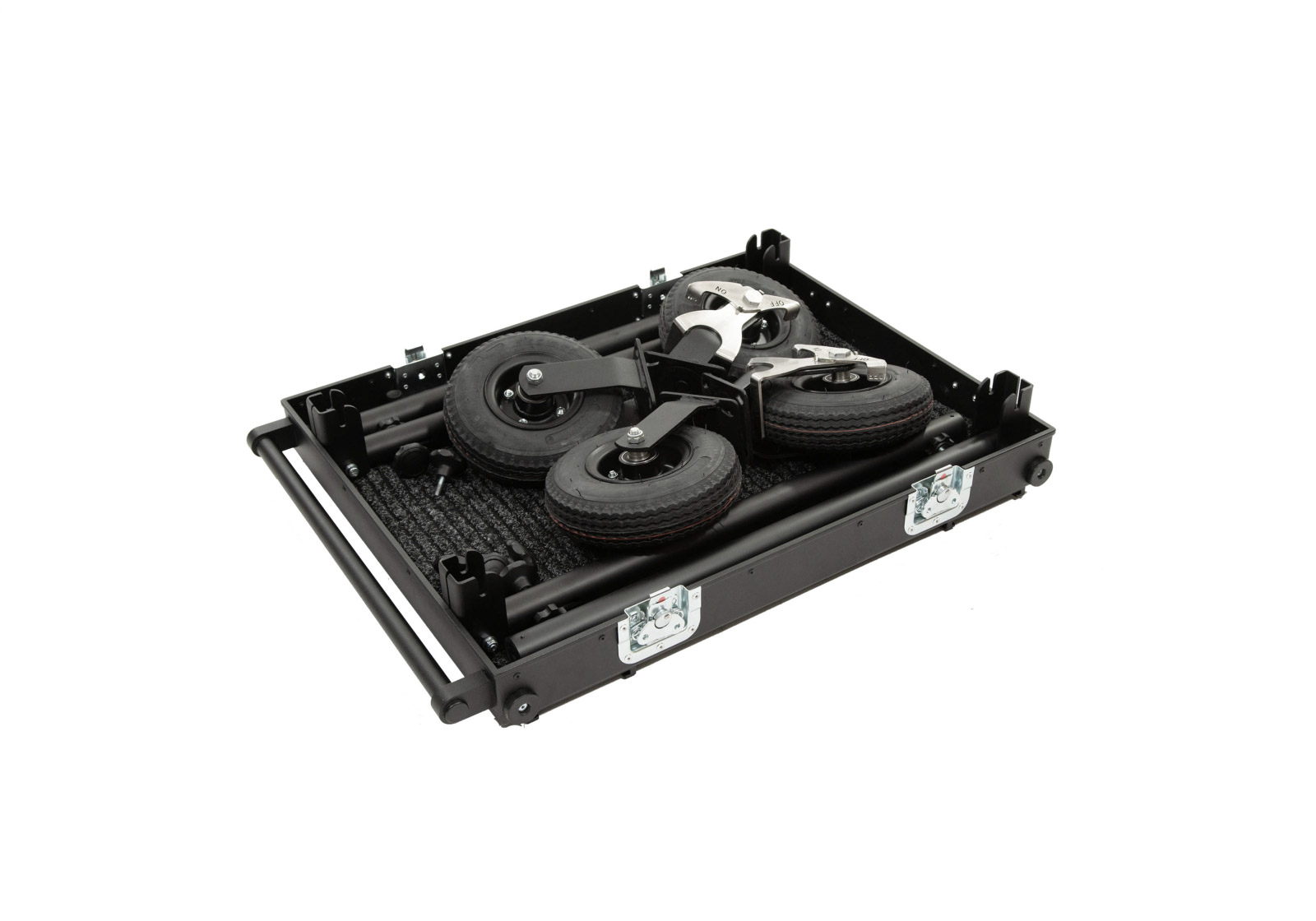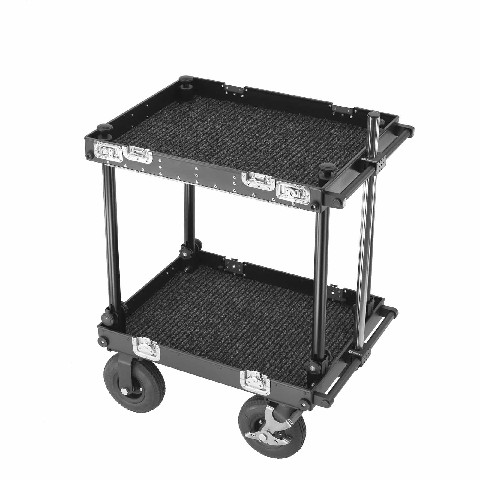 The SMARTONE MINI double deck cart can be used to transport equipment or as a sound department cart. We applied durable materials to face the harsh on set conditions, tires are made from 4-layer gum placed on strong steel rims equipped with 2 manual foot brakes with force regulation for secure and save routing on most of surfaces. Aluminum structure is lightweight and sustained enough to hold up to 200 kilograms, no tools are required to attach of remove each wheel or any part of the cart what saves your time. SMARTONE MINI is super easy to collapse and ready to use in less than 2 minutes. We developed a list of details which can improve the quality of usage like small transport wheels, props and deflects. Compact size allows the cart to transport easily all parts in one case. 220mm diameter wheels fits inside the collpased cart.